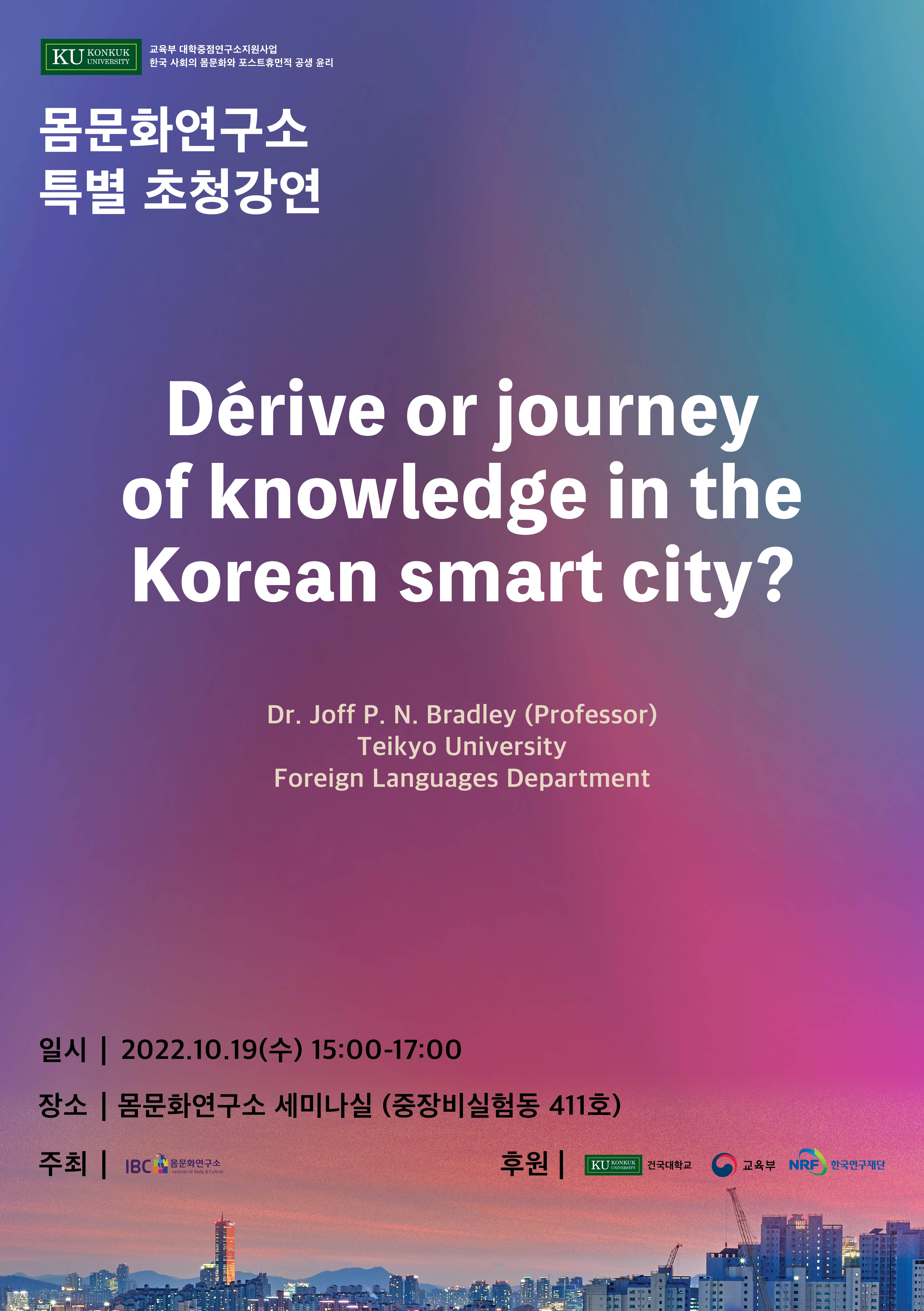일시 : 2022년 10월 19일(수), 15:00~17:00 장소 : 건국대학교 중장비실험동 411호(몸문화연구소 세미나실) 강연자 : Dr. Joff P. N. Bradley (Professor), Teikyo University, Foreign Languages Department 강연관련 문의 : kkbody@konkuk.ac.kr